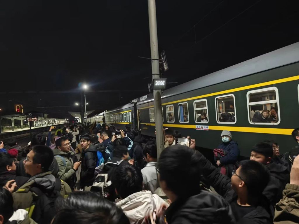 十二月九日二十一点二十分,K287列火车缓缓驶离松江北站,许多“铁丝”前来送行。铁路上海站 供图