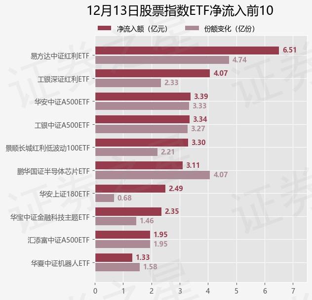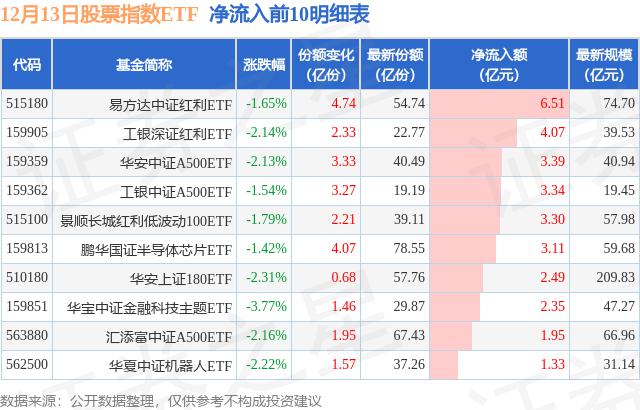 当天有 258 只股票指数 ETF 资金净流入,其中E基金净流入排名第一的是E基金中证红利。 ETF(515180),份额增加 4.74 十亿份,净流入额为 6.51 亿元。