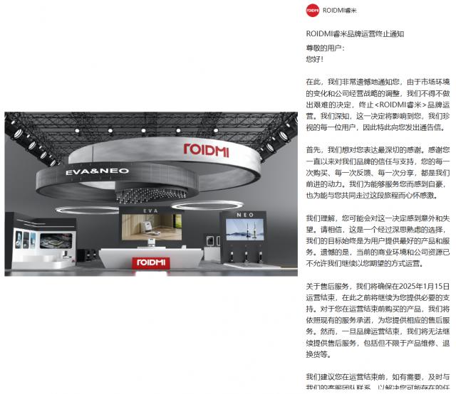 IT 世家 12 月 15 无锡瑞澜智能科技有限公司(瑞米品牌运营商)今日发布 ROIDMI 停止对睿米品牌运营的通知,IT 家庭附件通知原文内容如下: