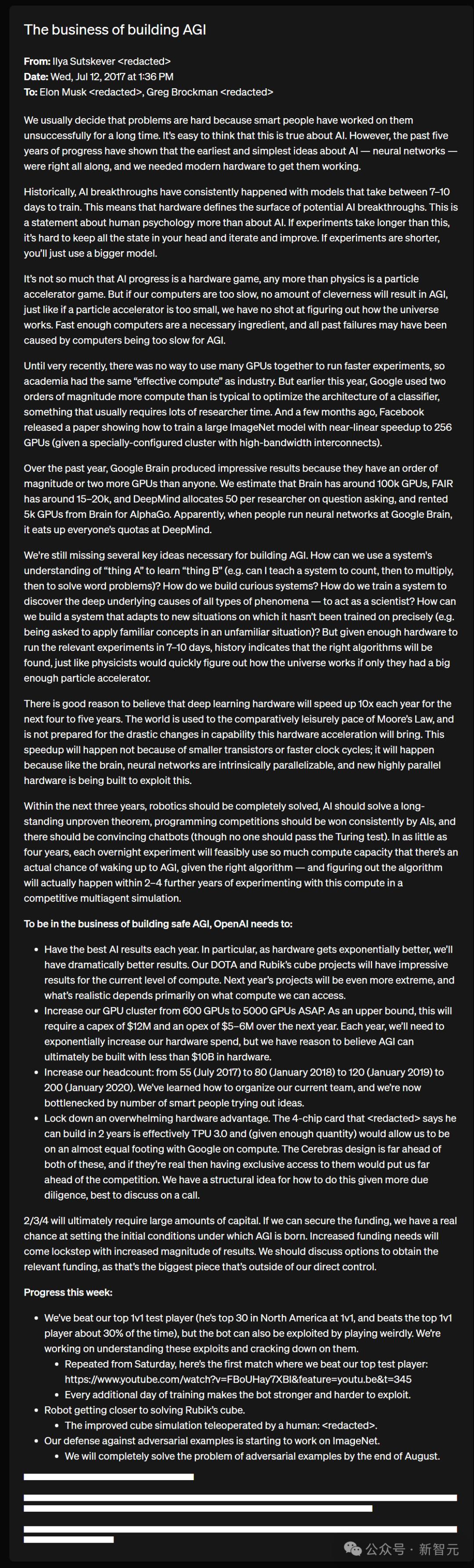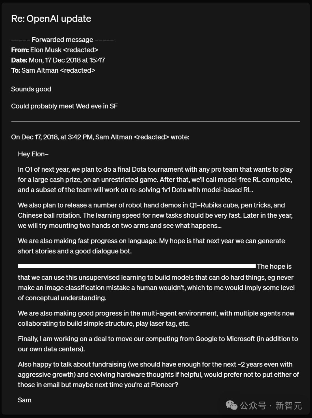 我们于2018年12月17日向马斯克发送了一份进展报告,告诉他「我们已经达成协议,计划将计算资源从谷歌转移到微软(这将与我们自己的数据中心并行运行)」。