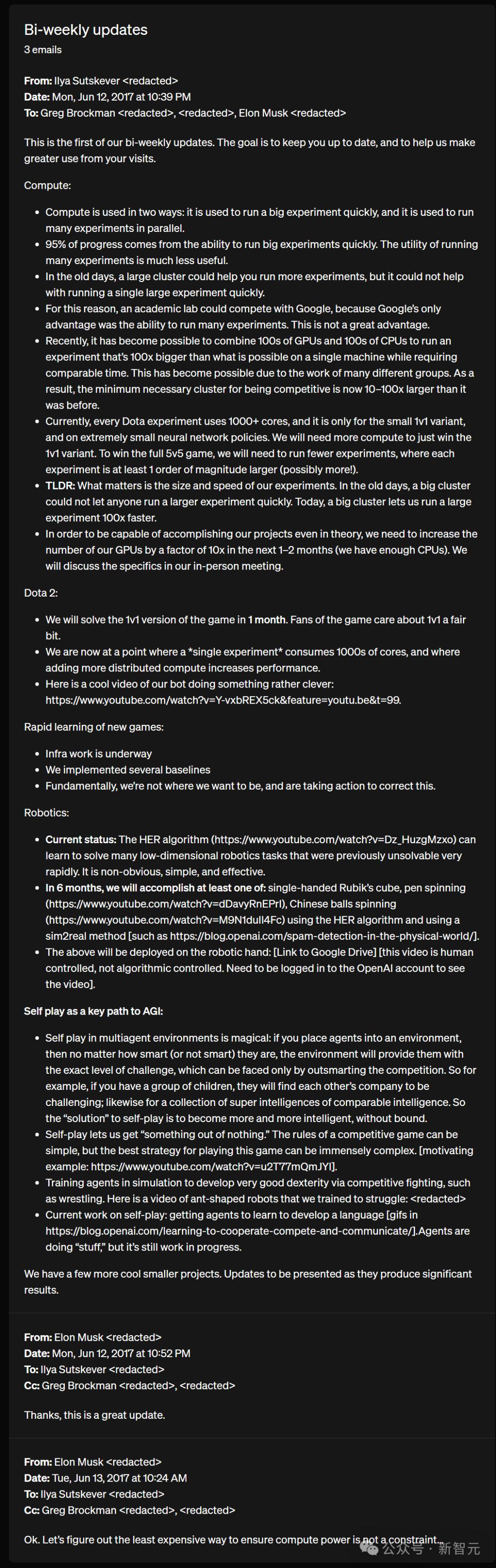 马斯克于2017年6月13日在一封邮件中回复:「好吧,让我们研究一下如何保证计算资源以最经济的方式不受限制…」