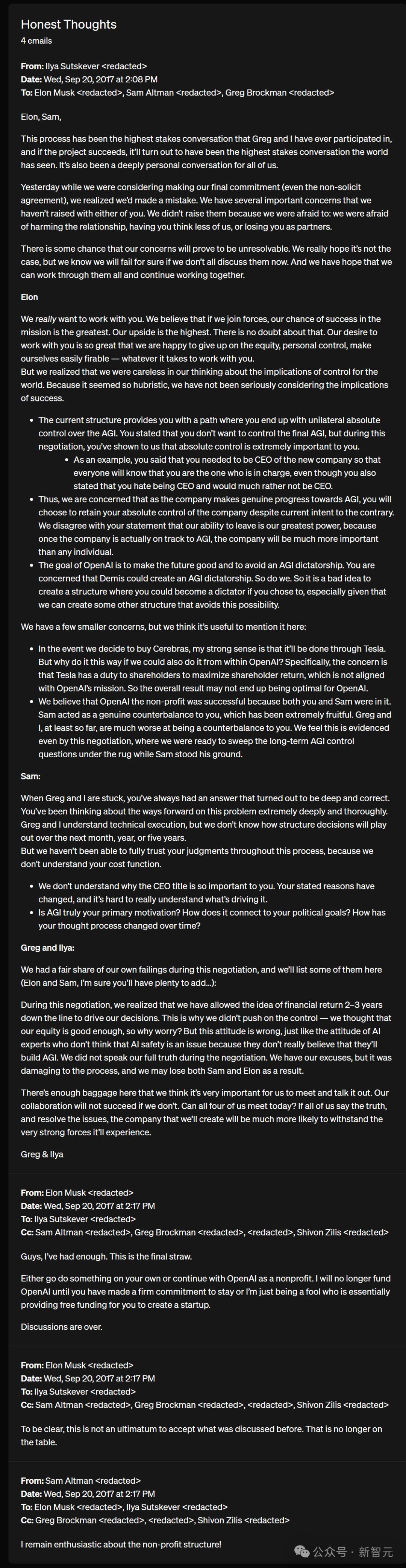 最后我们总结一下:「所以,我们担心,当公司在AGI领域取得实质性进展时,你可能会违背当前的意愿,选择保持对企业的绝对控制。」