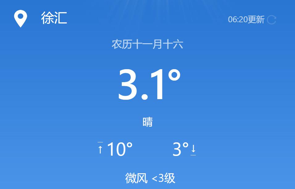 受辐射降温影响,上海气温今天上午(12月16日)仍处于较低水平,城区在3℃周边,郊区基本在冰点以下,青浦最低气温接近-4℃。预计今天天气晴朗多云,最高气温在10℃左右。西风3~4级,有轻度雾霾,易感人群注意保护。相对湿度80%~30%,空气干燥,注意补水。