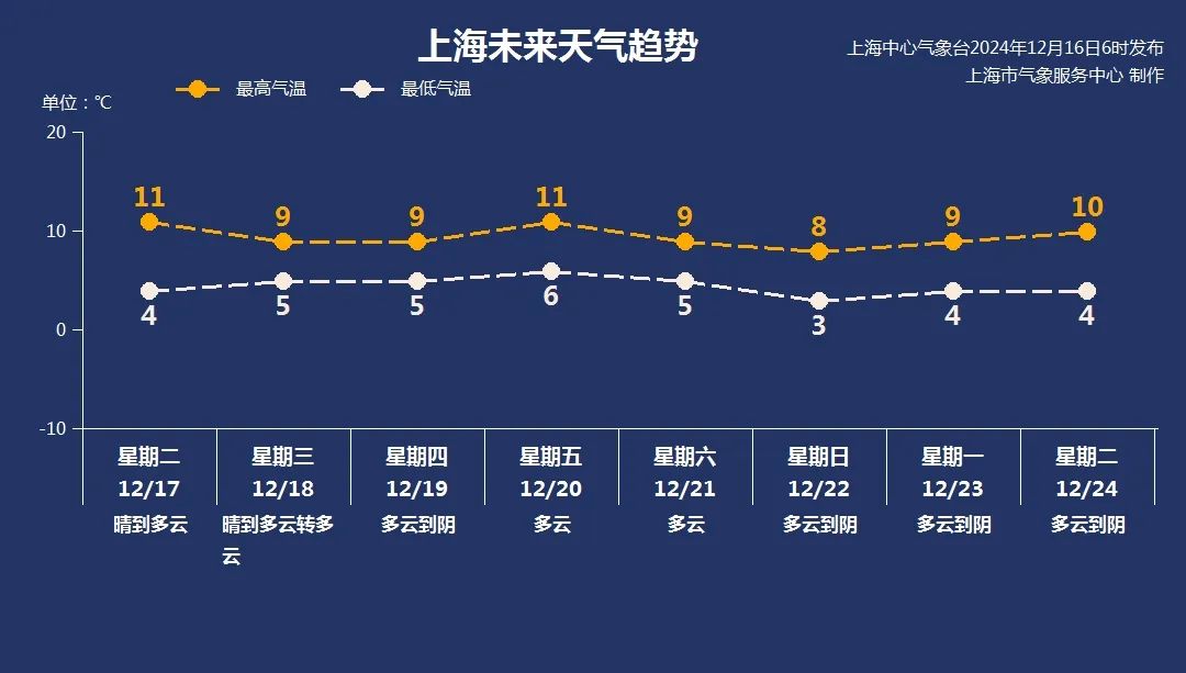 本周,上海的整个天气主要是阴天。其中,周四左右和周末,有一个增加云系统的过程。受南方冷空气持续补充的影响,本周气温略有波动,最低气温为3~6℃,最高气温为8~11℃。