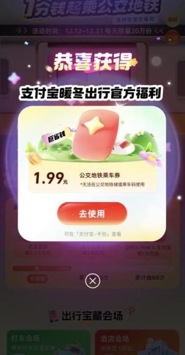 在2024年12月31日之前,打开支付宝搜索“暖冬出行”并点击“立即提取”按钮。