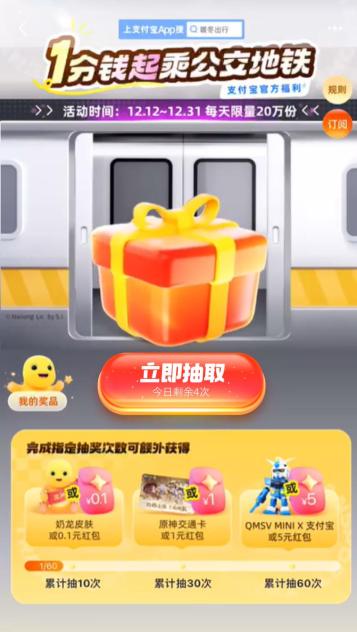 每人每天可抽奖5次,有机会抽取1.99元的公交地铁优惠券。此外,还有客运、网络汽车、自行车共享等全场景出行优惠券等着你~