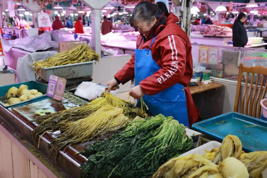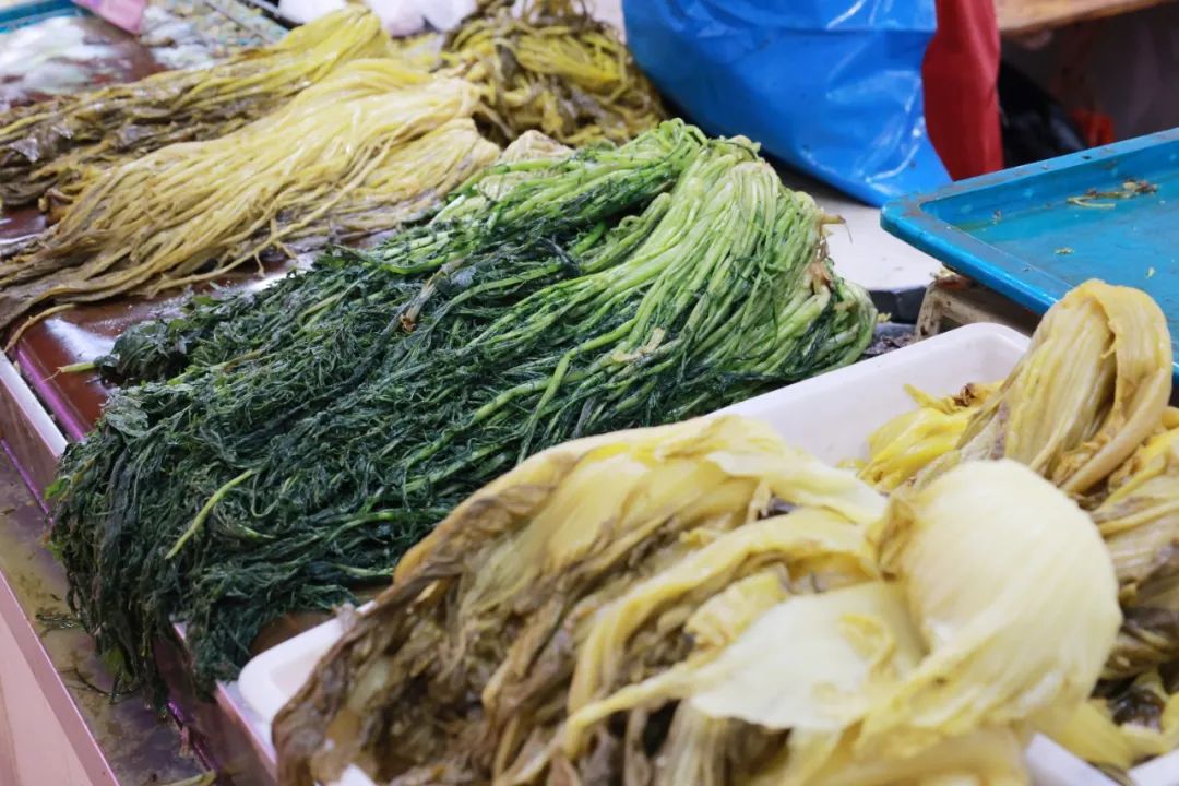除了琳琅满目的咸货,这个季节必不可少的美食之一就是腌菜。市场上有各种各样的腌菜,如雪糕、酸豆和泡菜。摊主热情地向记者介绍:“这些都是刚腌好的,很新鲜,菜都是自己种的。雪菜卖得好,价格便宜,一斤4-5元左右。”