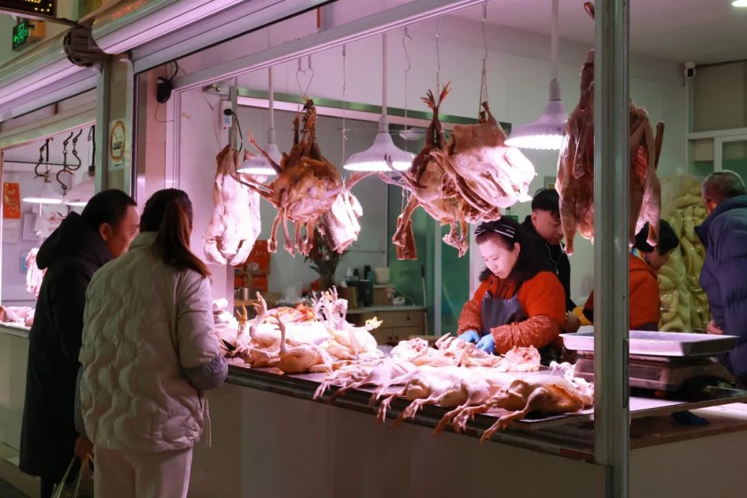 除了腌制的香肠和咸肉,腊肉市场还有咸鸡、咸鸭、咸鹅、闲鱼等。以咸味为主。记者在卖光禽的摊位前看到,一串串风干的鸡鸭鹅整齐地排列悬挂着,有着浓浓的年味。