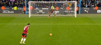 第86分钟,努内斯在后场失误被切断,随后努内斯在禁区内放下阿玛德·迪亚洛,裁判判罚点球,B费主罚点球一蹴而就,曼城1-1扳平曼联。