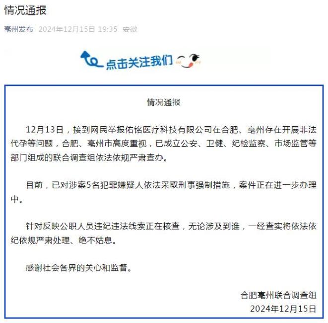 12月13日,合肥、亳州市高度重视网友举报佑铭医疗科技有限公司在合肥、亳州存在非法代孕等问题,成立公安、卫生健康、纪检监察、市场监管等部门组成的联合调查组,依法依规严肃查处。