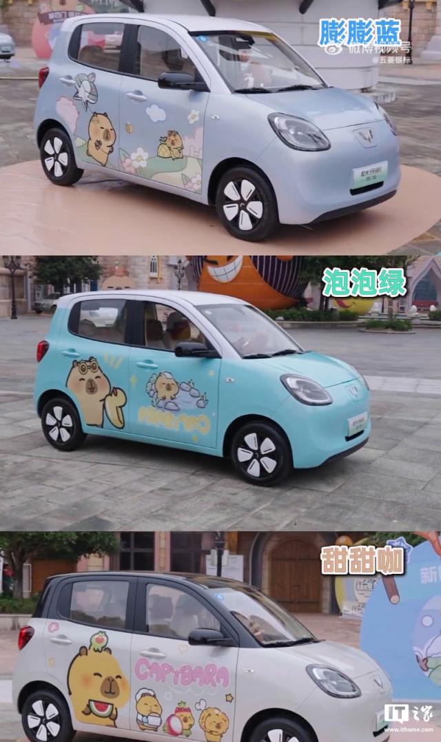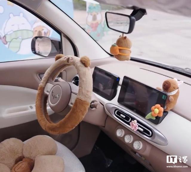 视频里,这款卡皮巴拉小黄豚联名新车,选择“微笑”前脸组合灵动的“菱翼” LED 大灯和“紫荆花” 13 寸轮毂,有三种彩色高定车色:膨胀蓝、泡泡绿、甜咖啡。内饰采用全新的“焦糖奶油”配色,以淡淡的巧克力棕色为主色调,搭配奶酪白进行装饰。