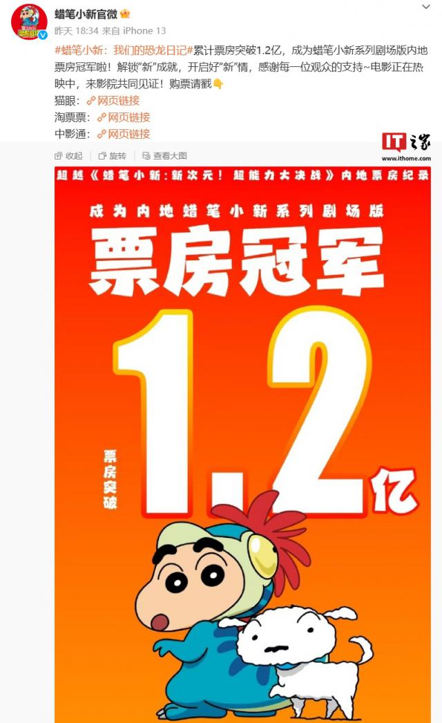 IT 家人注意到,今年的剧场版电影《蜡笔小新:我们的恐龙日记》已经在今年了。 11 每月在国内上映,目前豆瓣评分 6.6,获 12% 的 5 星星评估,24.5% 的 4 星评价、47% 的 3 星星评估,14.4% 的 2 星评价以及 2.2% 的 1 星评价。昨日,“蜡笔小新”官微发文称,该片累计票房突破 1.2 亿,成为蜡笔小新系列剧场版。大陆票房冠军。