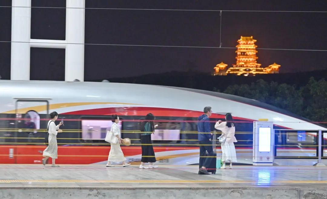 洛阳龙门站位于古城洛阳,龙门石窟位于中国四大石窟之一。乘客可以在站台上与复兴号和牡丹阁同框拍照。