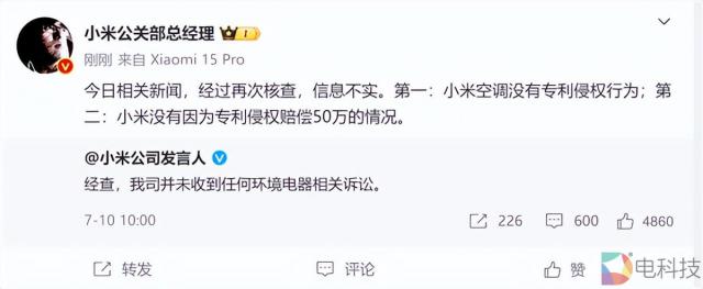 然而,小米很快回应了这件事。小米公关部总经理王化表示,经核实,相关信息不属实,小米空调不会有专利侵权,也不会因侵权被判赔偿。这种回应无疑是对格力电器董事长董明珠言论的直接反驳。