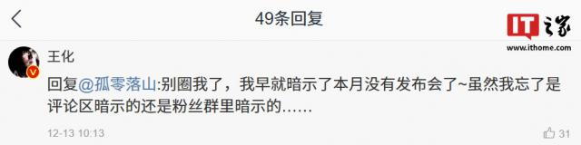 IT 王腾这个月(12月12日) 月 13 日本)在微博评论区发布,他自己明确表示。 12 每月最后一份工作"计划有变"。另外,小米公关部总经理王化也在评论区回复说:“我早就暗示了。这个月没有发布会"。