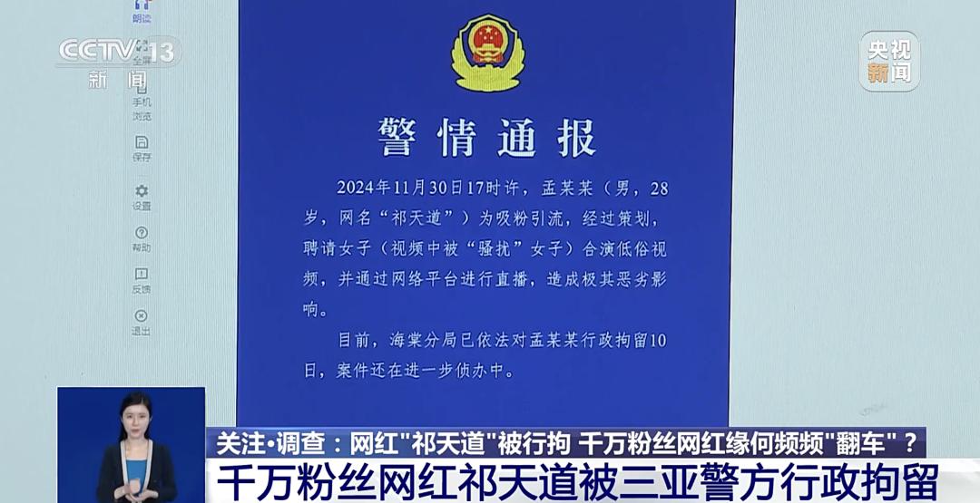 12月4日,三亚市公安局海棠分局通报,孟某某(男,28岁,网名“祁天道”)聘请女性(视频中被“骚扰”的女性)出演低俗视频,并通过网络平台直播,造成极其恶劣的影响。海棠分局已依法拘留孟某某10天,案件仍在调查中。