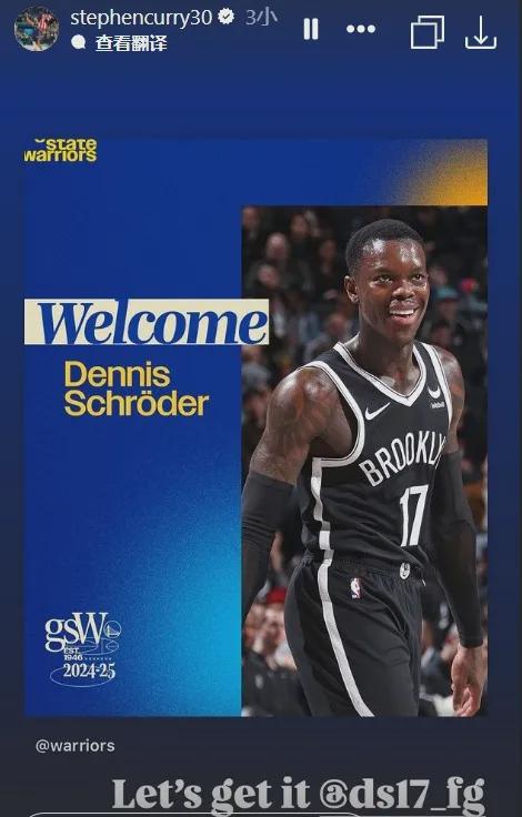 与此同时,勇士也正式宣布从篮网获得施罗德和 1 一轮又一轮的交易,支付了梅尔顿、比克曼和 3 作为筹码,库里第一时间发了一条欢迎信息,给了新援足够的面子。