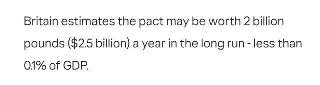 路透 · 据社会报道,英国政府估计,从长远来看,协议将每年带给英国 20 约合1亿英镑 183.6 经济增长亿元人民币。