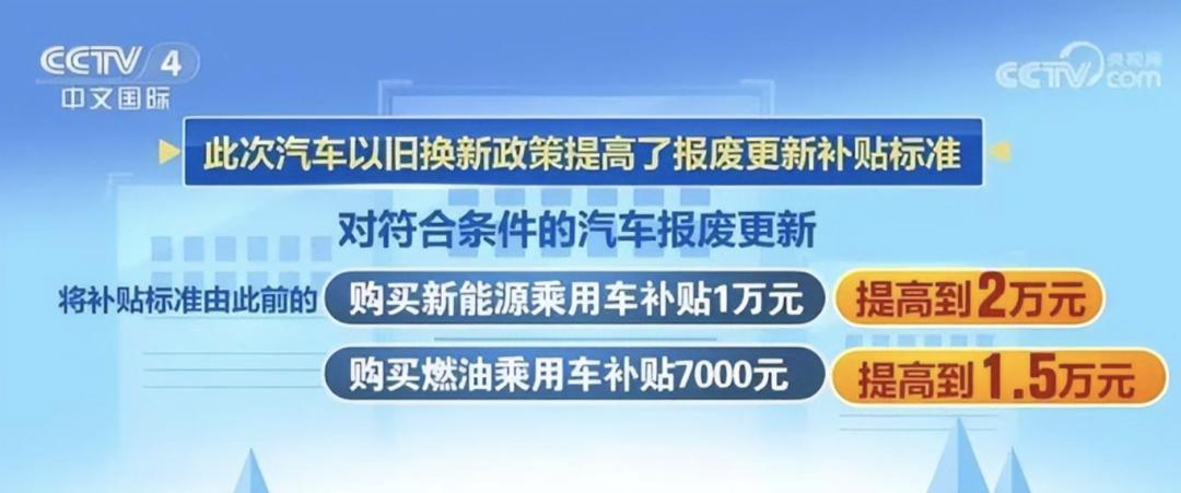 8月16日,商务部等7个部门发布的《关于进一步做好汽车以旧换新工作的通知》指出,凡符合《汽车以旧换新补贴实施细则》要求的个人客户,报废旧汽车并购买新汽车,补贴标准由购买新能源乘用车补贴1万元,购买燃油乘用车补贴7000元,分别提高至2万元和1.5万元。
