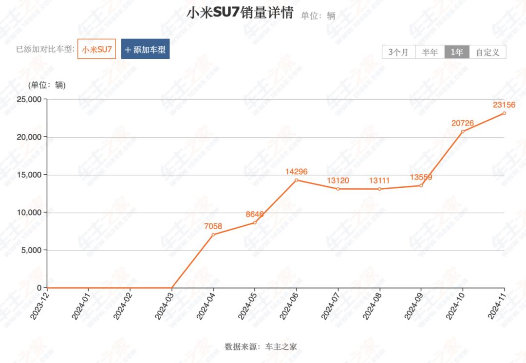 凭借雷军的个人魅力和小米SU7的产品亮点,小米SU7自4月份交付以来销量已超过11万辆。其中,11月份,小米SU7以2.3万辆车的成绩成为11月份国内造车新势力汽车榜第一,与第二名相差甚远。