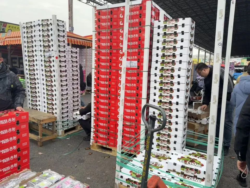 12月13日上午,江南市场进口水果区的叫卖声此起彼伏,供应商穿梭于货叉车和三轮摩托车之间。早上8点,一个老板以300元/10公斤的价格购买了一个J级樱桃,最后在阿根廷生产了9箱。