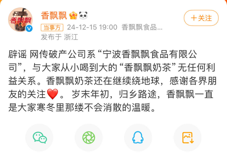 15日晚,香飘飘传言网爆破产公司是“宁波香飘飘食品有限公司”,与“香飘飘奶茶”没有利益关系。“香飘飘奶茶还在绕地球走”。