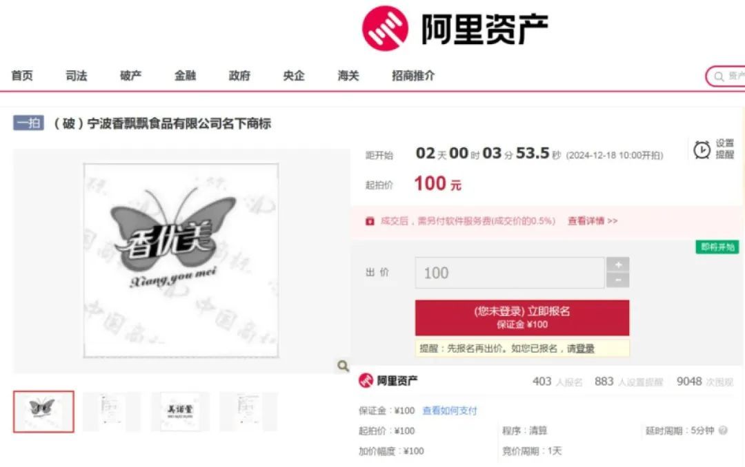 根据阿里资产(原阿里拍卖)官网,12月18日,宁波香飘飘食品有限公司名下的两个注册商标“香美” 美诺萱将被破产拍卖,起拍价100元,保证金100元。