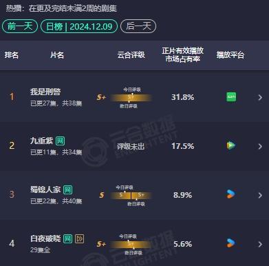 然而,令人惊讶的是,《九重紫》开播的云合市场份额已经达到第六位,集均突破1000万,第二天在云合日榜上排名第二,市场份额翻了三倍。目前整部电影的有效播放量已经超过3000万,腾讯的人气已经超过28000,走势还在上升。