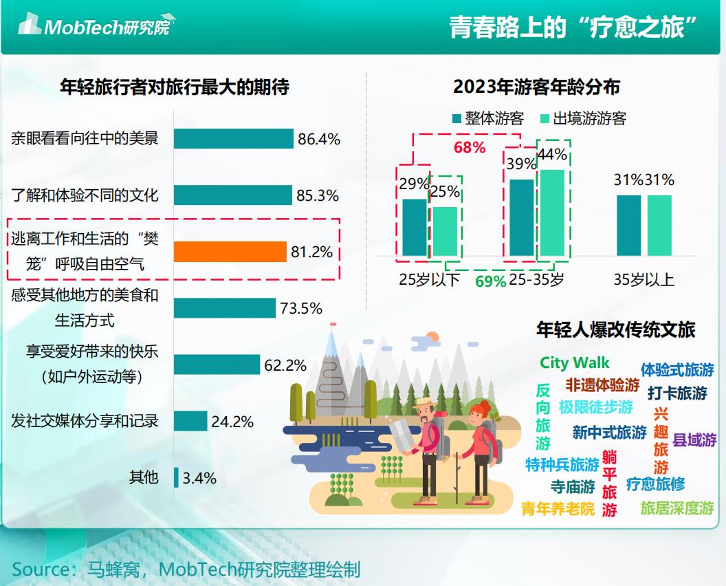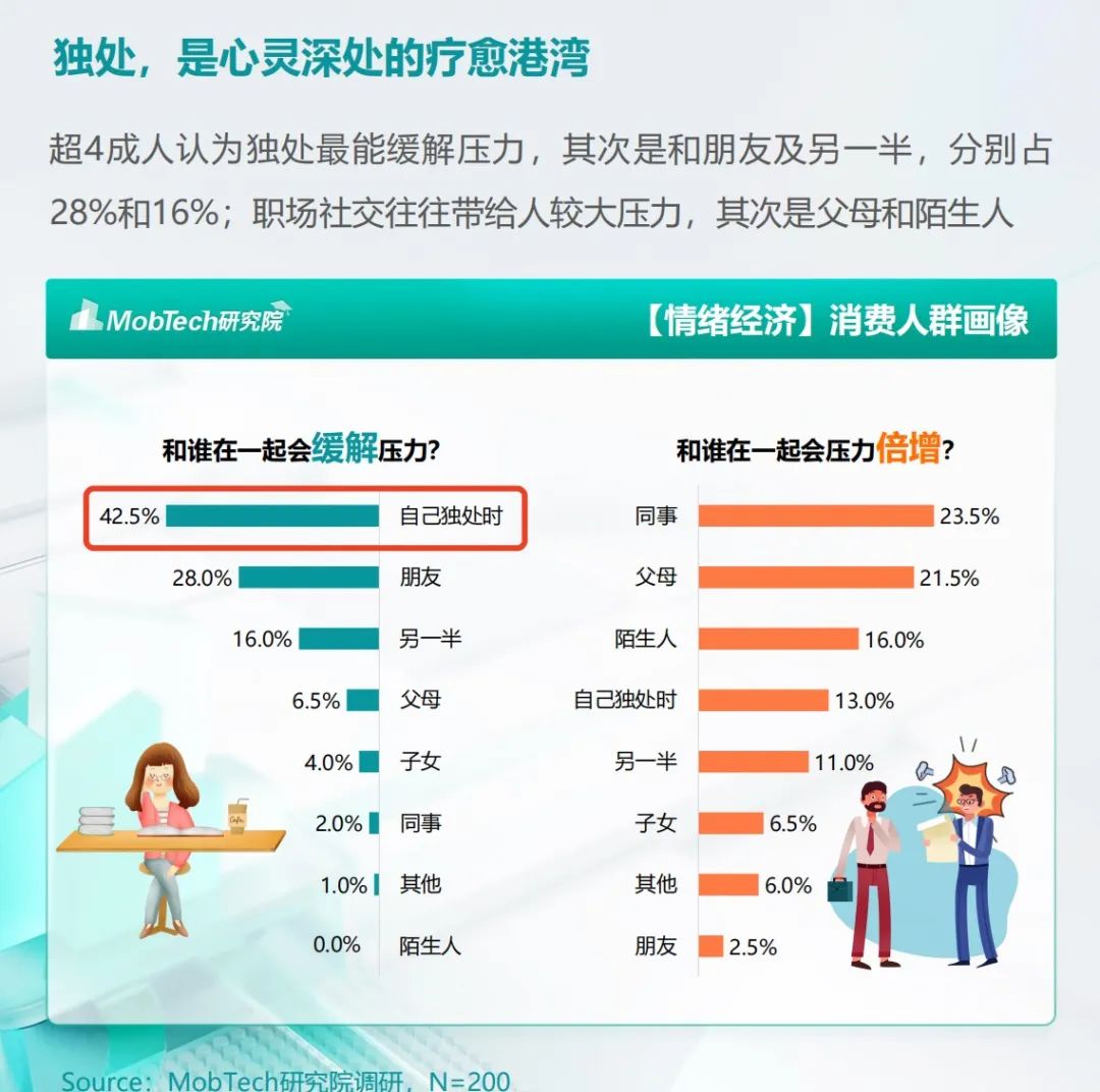 根据MobTech研究院对2024年情绪经济消费者的洞察,近一半的年轻人觉得自己一个人的时候压力最大,没有激烈的观点碰撞,也没有负面情绪的波动。一个人的旅行已经成为年轻人青春路上的“治愈之旅”。