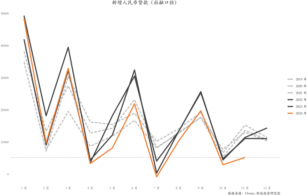 2024年11月,新增社会融资2.34万亿元,市场一致性预期为2.9万亿元,低于预期。新增人民币贷款5800亿元,市场一致性预期为9208亿元,低于预期。M2同比增长7.1%,市场一致性预期为7.4%,低于预期。
