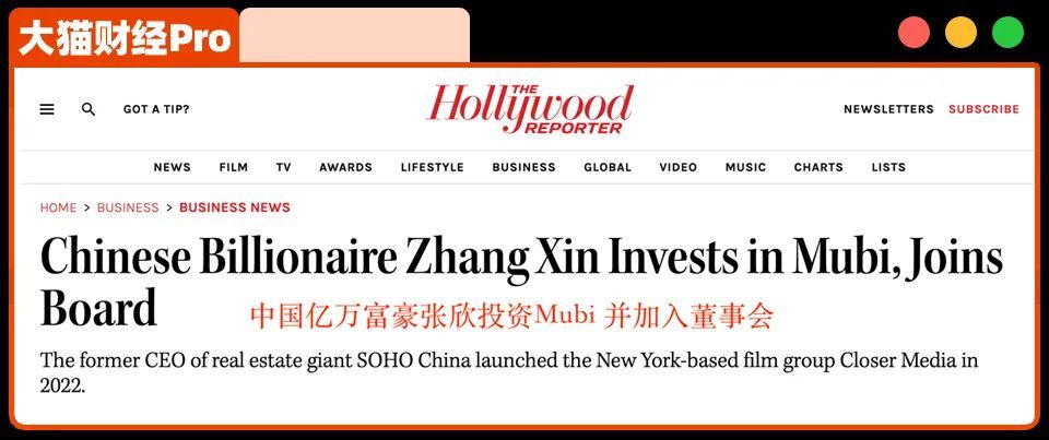 在美国,张欣投资了Mubi的流媒体平台,尽管没有公布额度,但应该不低,张欣直接进入股东大会。