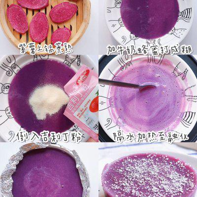 1、将紫薯切片蒸熟,与牛奶混合。 / 将蜂蜜混合成糊状。倒入吉利丁粉,隔水加热搅拌至融化。