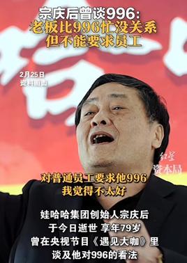 宗庆以后自己每天工作16小时,却从不要求员工一起加班,还指责996文化。