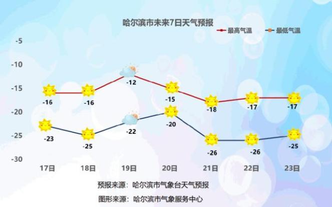 17日白天最高气温:大兴安岭南部、齐齐哈尔南部、大庆、绥化南部、哈尔滨西部、牡丹江-14~-12℃,其他地区-18℃~-16℃。
