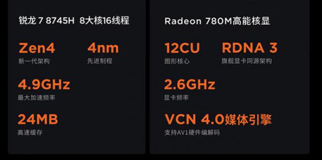● CPU 是锐龙 7 与锐龙相比,8745H 7 8845H 砍了啥?它俩都是 8 核 16 过程,Zen4 架构 4nm 制程。不同之处在于,最高加速频率,锐龙 7 8745H 是 4.9GHz,比锐龙 7 8845H 低 200MHz。核显都是 12CU 款 780M,但锐龙 7 8745H 核显频率低 100MHz,为 2.6GHz。然而,这些点可以忽略不计。最大参数值的区别是锐龙。 7 8745H 砍掉了 NPU,不支持 AI 引擎。这个影响是什么?坦率地说,对大多数客户的应用没有影响——真的没有人会用轻薄的笔记本来做。 AI 应用吧?另外,现在轻薄本常用的大文字模型,实际上不能使用独立的文字模型。 NPU。不过锐龙 7 8745H 小天的版本没有内置应用(联想的大模型 AI 应用程序),这可能是一个比较明显的缺点。