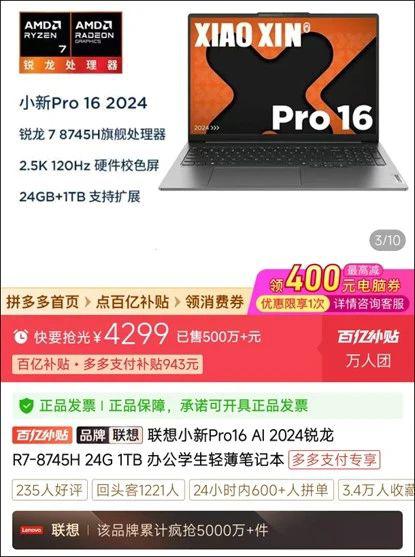 这个产品就是联想小新 Pro 上面是牛叔在拼多多上的价格截图,到手的价格是: 4299 元素,具体配置为锐龙 7 8745H,24GB 内存,1TB SSD,搭载 2.5K 120Hz 高分高刷屏。