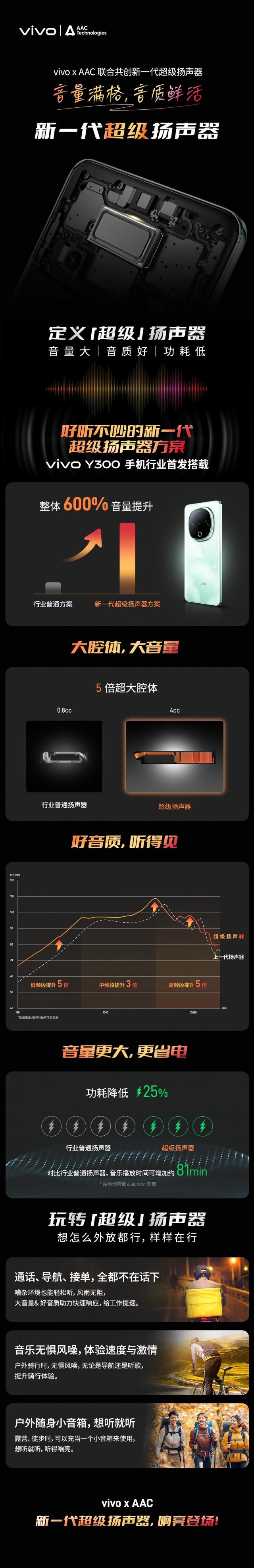 12 月 16 日,vivo Y300 正式发布,作为 Y 新成员系列,vivo Y300 主要推广超强外放,并具有超长续航、超亮护眼屏、旗舰外观设计等卖点,为用户带来全新的同价位段体验。尤其在声音体验方面,vivo 与行业领导人携手 AAC 瑞声科技领先全新赛道,联合创造的新一代非常音箱,带来了前所未有的 600% 超大音量,响亮而清晰的声音很容易满足各种环境的大音量听声需求。