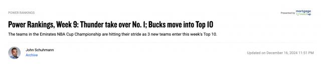本周令人惊讶的团队:2 胜 0 负面雷霆,他们成功地淘汰了独行侠和火箭队。 NBA 杯子决赛;令人失望的队伍:0 胜 1 负的 76 人类,伤病已成为这个团队的主旋律。