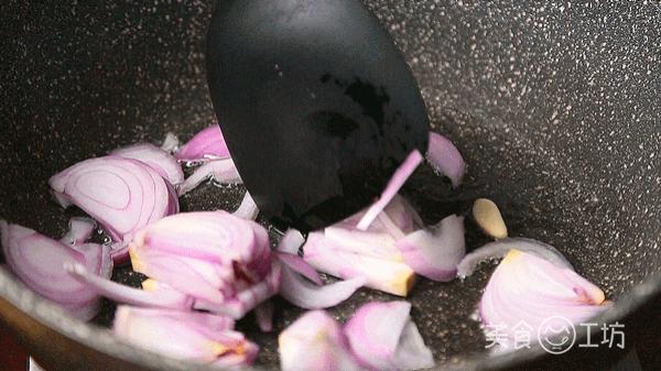4. 锅内滚油,加入洋葱、蒜粒爆香,加入土豆、红薯、胡萝卜撒盐和黑胡椒,炒至五分熟,酌情加入少量热水。