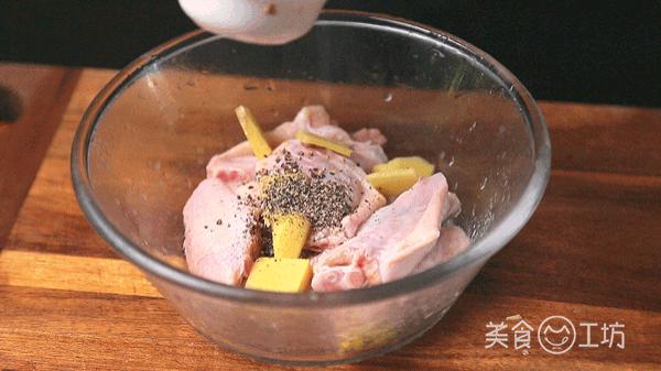 2. 鸡翅、大虾、鱿鱼分别加入黑胡椒、姜片、少许盐和料酒,腌制均匀。 20 分钟。