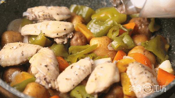 5. 加入鸡翅和青椒,盖上炖煮。 10 分钟。
