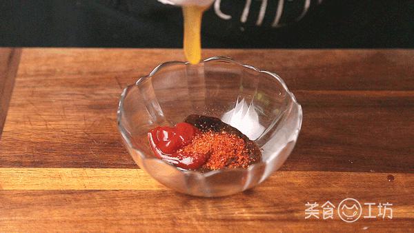 3. 配三汁酱,甜面酱:油耗:番茄酱 =2:2:1 加少许蜂蜜,酱油,辣椒粉拌匀备用。