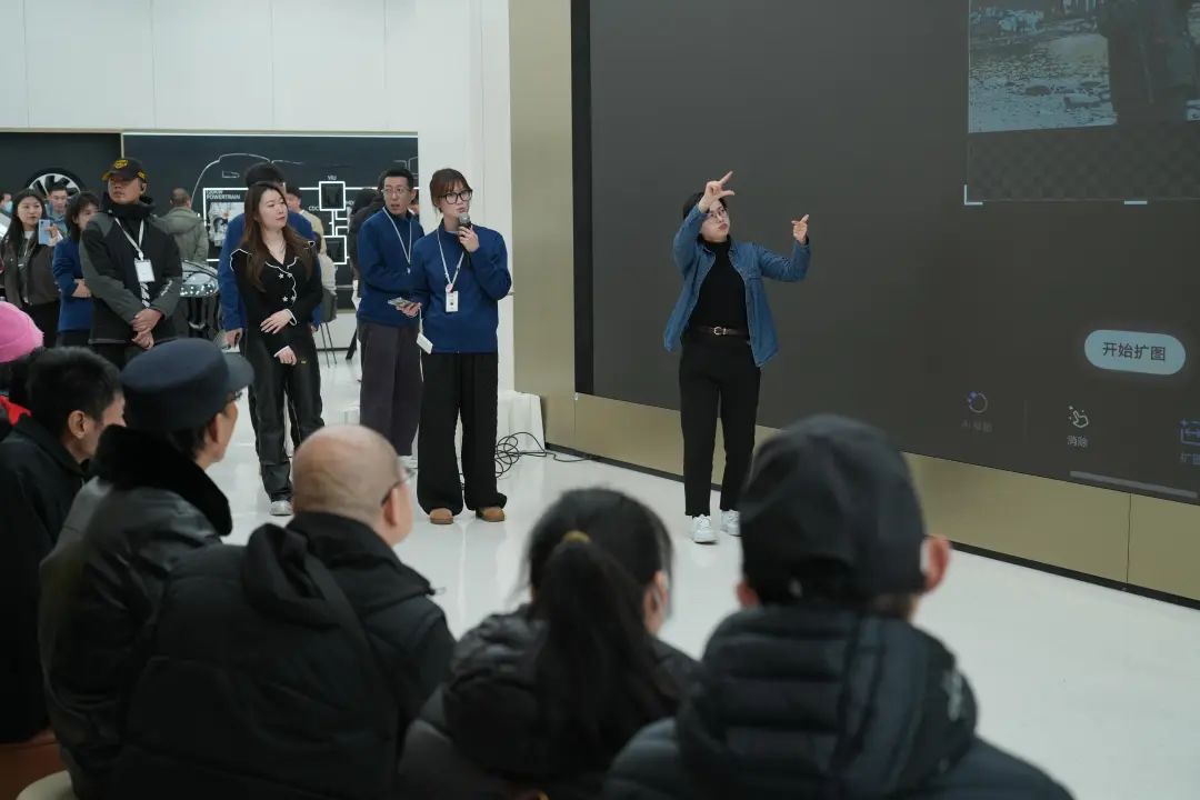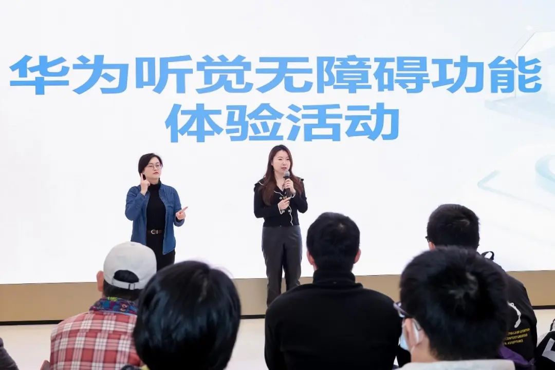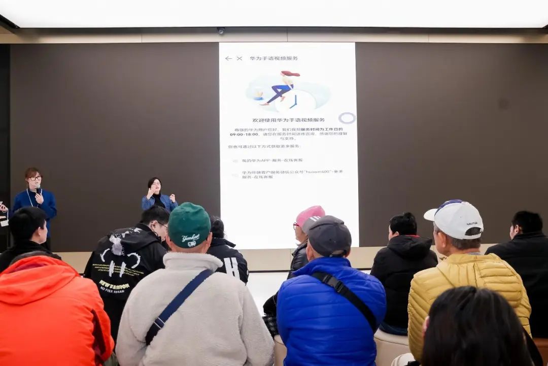 十二月十五日下午,华为旗舰店・上海南京东路与黄浦区残疾人联合会携手,为听障人士打造了华为听觉无障碍专属功能体验活动,上海众多本地听障人士期待参与。活动开始前,工作人员热情地引导听障人员进入现场,为他们贴心地配置了几个手语翻译。这类手语翻译就像无声世界和有声世界之间的灵动特使,用双手传递信息和情感。