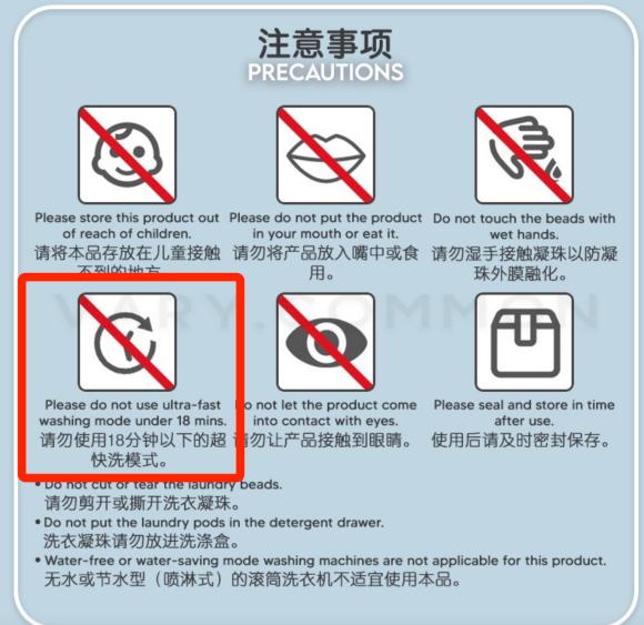还有一些洗衣珠会标注“请勿使用” 18 超快洗分钟以下"请勿使用节水洗衣机",这些实际上都考虑到用水过少可能会导致洗涤剂附着在衣服上。