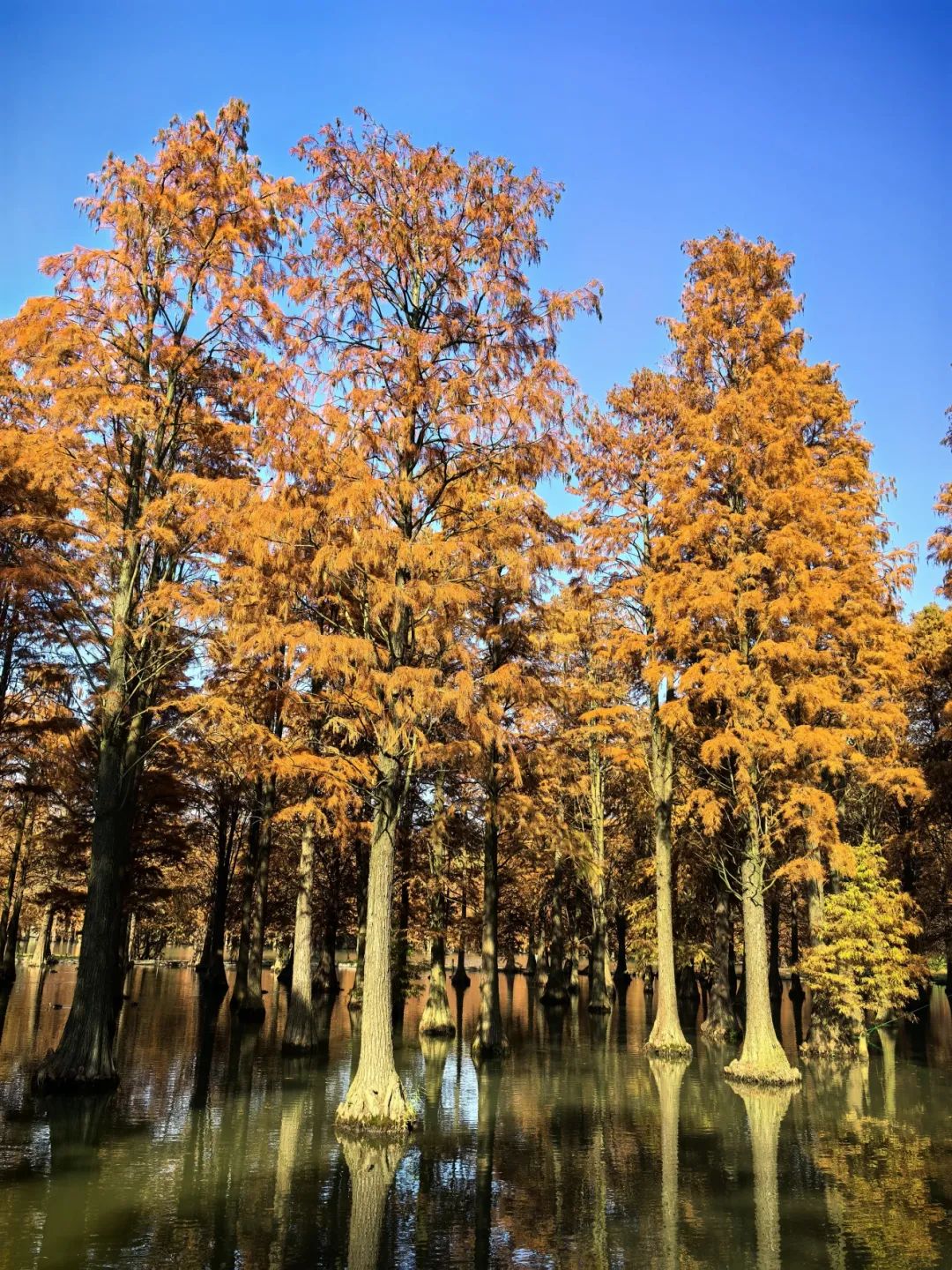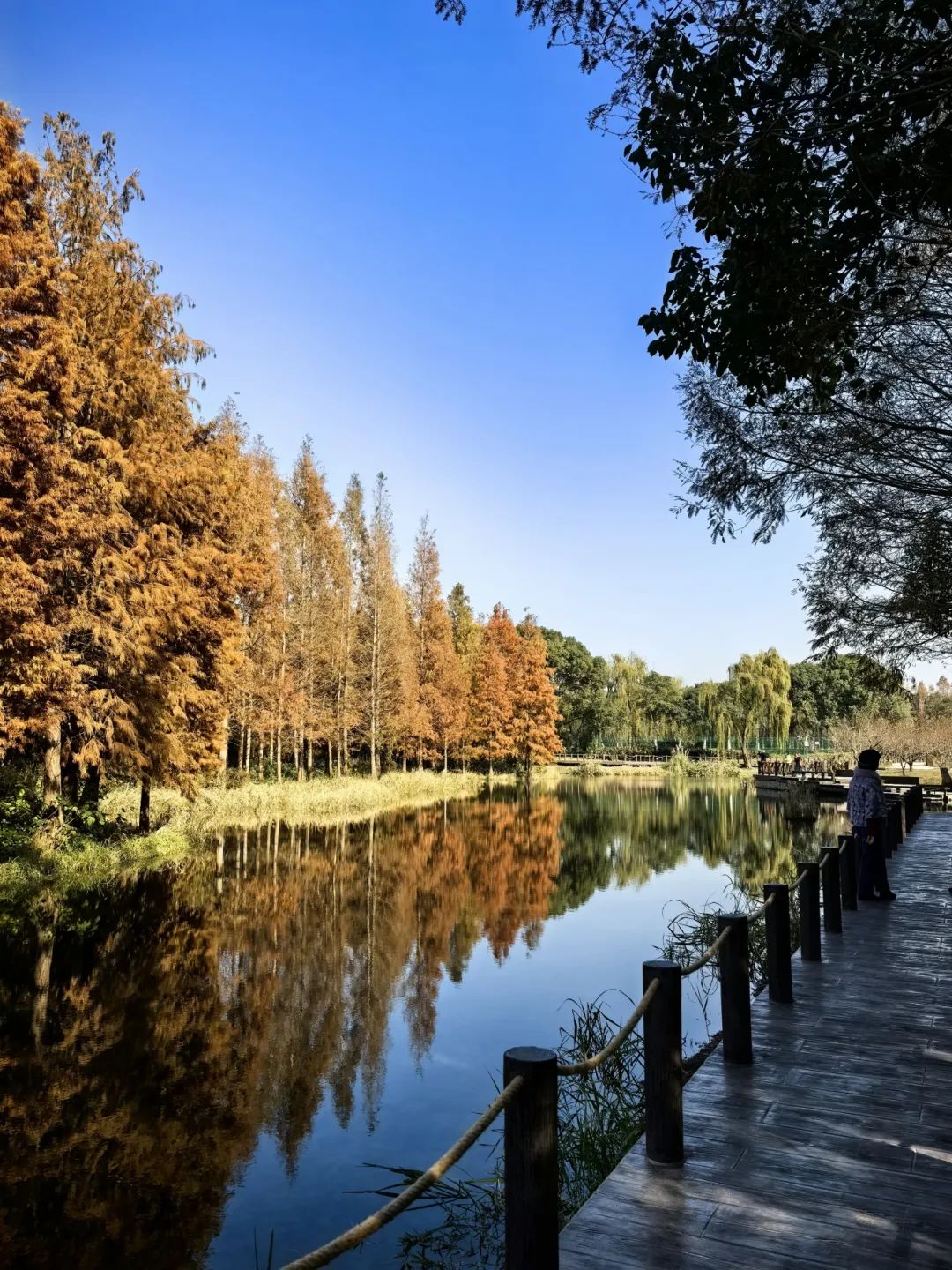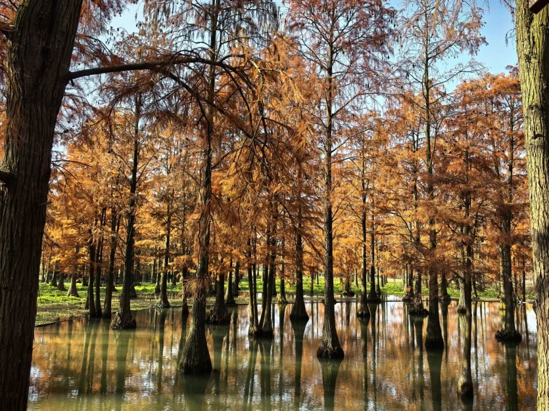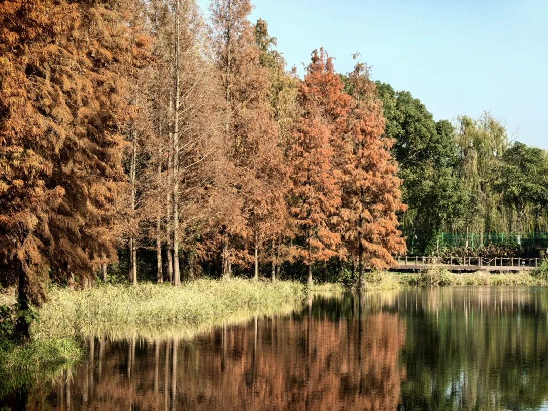 他说:“我来过几次,这个季节池杉的倒影和颜色都特别迷人,一直想拍照,今天天晴很快就来了。”摄影师黄先生告诉记者。位于上海青浦区的青西郊野公园,是一座兼顾自然风光和生态保护的城市绿洲。水面森林覆盖面积超过60亩,池杉生长超过2800株,尤其是每年秋冬季节。当温度下降时,叶子从绿色变成黄色,变成红色,就像被大自然的画笔染上了浓烈的色彩。“在过去的两个星期里,池杉逐渐从绿色变成了黄色,现在基本上变成了红色。这是我们池杉最美的时光,一般会持续到1月中旬。”上海青西投资发展有限公司总经理王纪潘告诉记者。