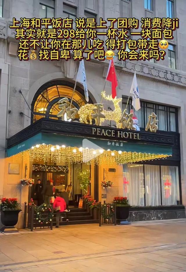 最近,一位网友发帖称,上海和平饭店进行了团购,298 块的套餐内容是参观大厅,并提供一杯水、一块面包,“还不能在饭店吃饭,要打包带走,花钱找自卑”。