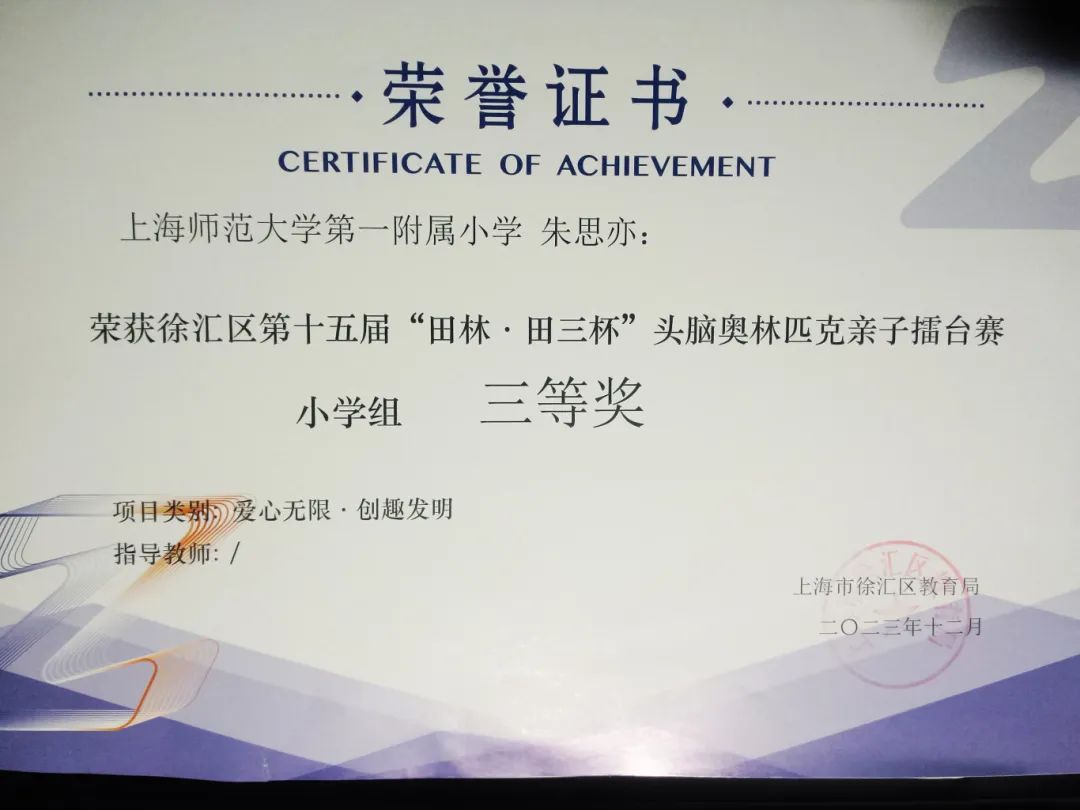这项小发明获得了2023年徐汇区第十五届“田林·田三杯”头脑奥林匹克区三等奖