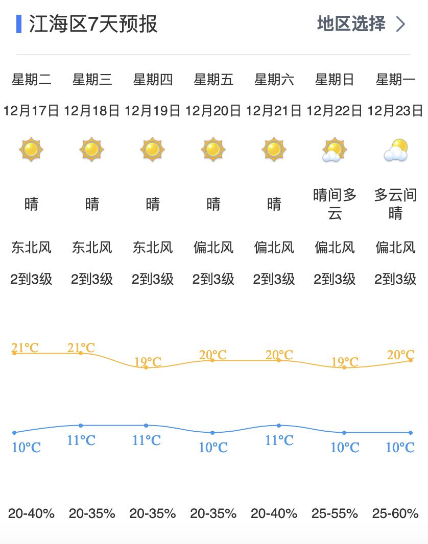 根据@江门天气,预计未来一周冷空气会频繁,晴朗干燥的天气会持续增加昼夜温差,早晚体验寒冷。风干物燥,请注意护林防火和家用火用电用气的安全。