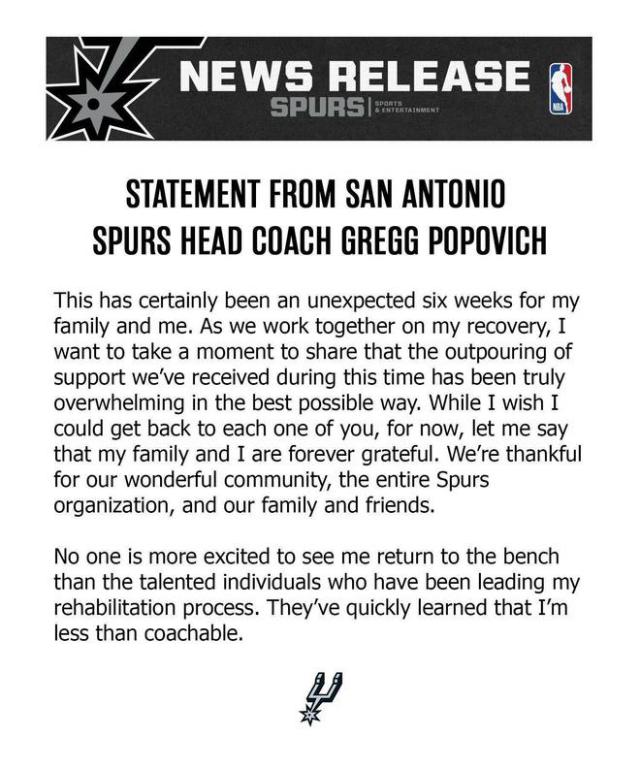 北京时间 12 月 17 日本,马刺正式发表了主教练波波维奇的声明,这是波波中风后的第一次公开发言。在声明中,他感谢过去六周照顾自己、祝福自己的人,并嘲笑自己是一个难以执教的成员。声明如下——
