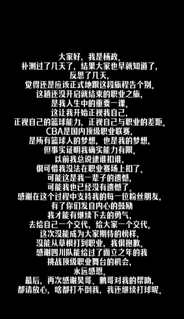 “感谢每一个在这个过程中支持我的粉丝朋友。有了大家发自内心的鼓励,我才能有继续下去的勇气,给自己一个解释,给大家一个解释。这一次,我没能成为大家期待的榜样,也没能从基层打职业。我很抱歉。感谢四川队给了我一个挑战顶级职业舞台的机会,永远感恩。最后,再一次感谢昊哥、鹏哥对我的帮助,请放心,没有什么能打败我,我还在继续打球。"